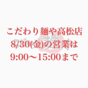 | 2024/08/30 | こだわり麺や高松店 8/30(金)の営業について |