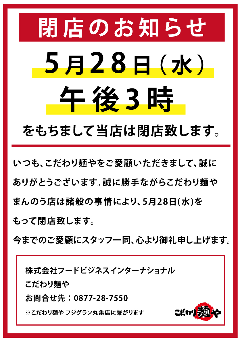 | 2025/05/14 | こだわり麺や まんのう店 閉店のお知らせ |